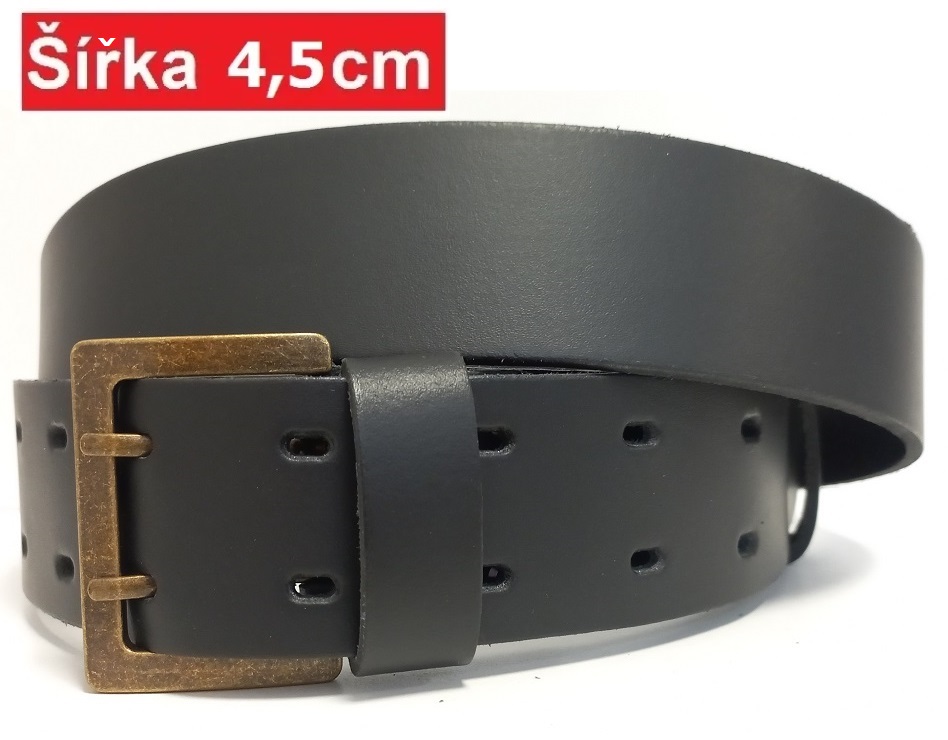 Černý pásek z hovězí kůže o šířce 4,5 cm.