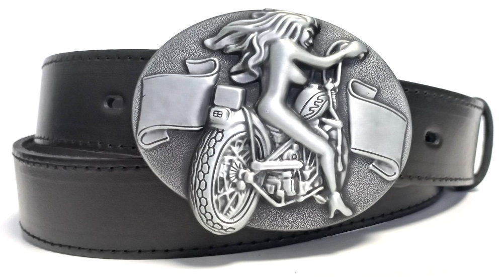 Trendy moto přezka. Plná přezka s krásným designem se ženou a motorkou vhodná pro opasky do šířky 3,9 cm. 3D opasková spona.