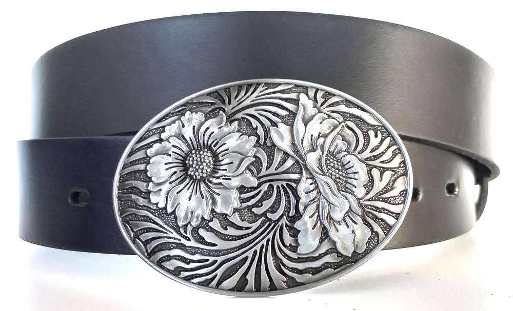 Černý kožený pásek s plnou přezkou s květinami