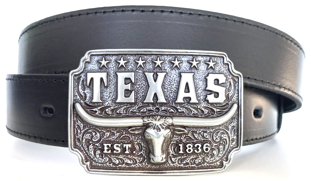 - kožený pásek s cowboy tmavou 3D přezkou Texas vhodný do riflových kalhot