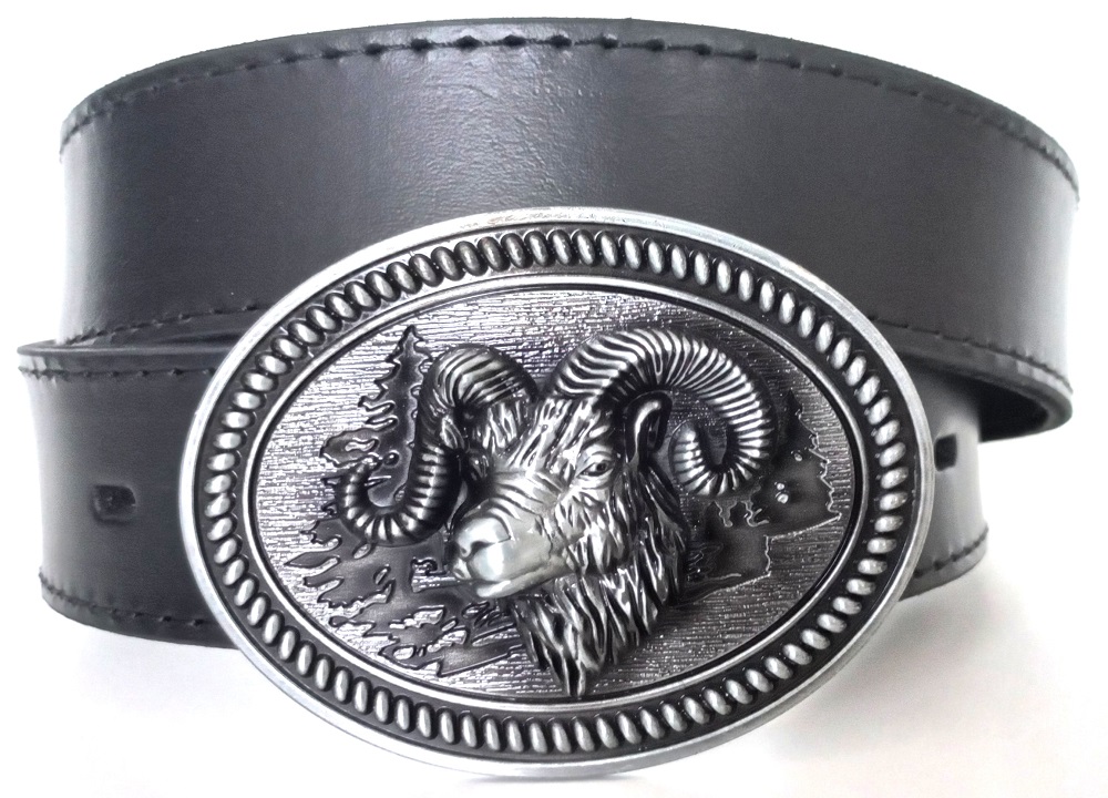 Pásek z černé hovězí kůže se starostříbrnou přezkou s mysliveckým motivem s muflonem.