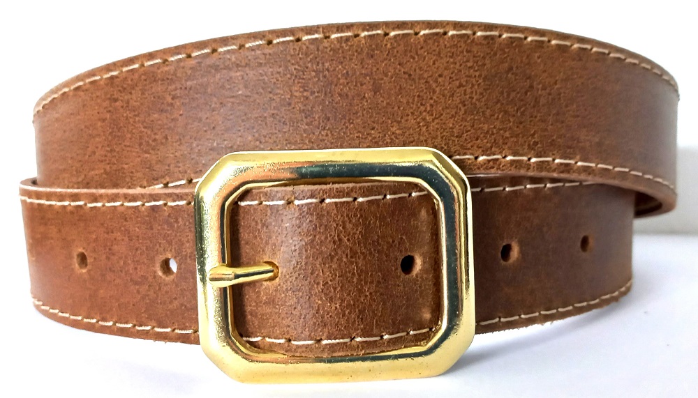 - světlehnědý kožený pásek s krásnou mosaznou kovovou přezkou v zlaté barvě