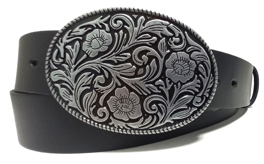 Celokovová přezka na opasek. Plná přezka s ornamentem v italském designu a starostříbrné barvě pro opasky do šířky 3,9 cm.