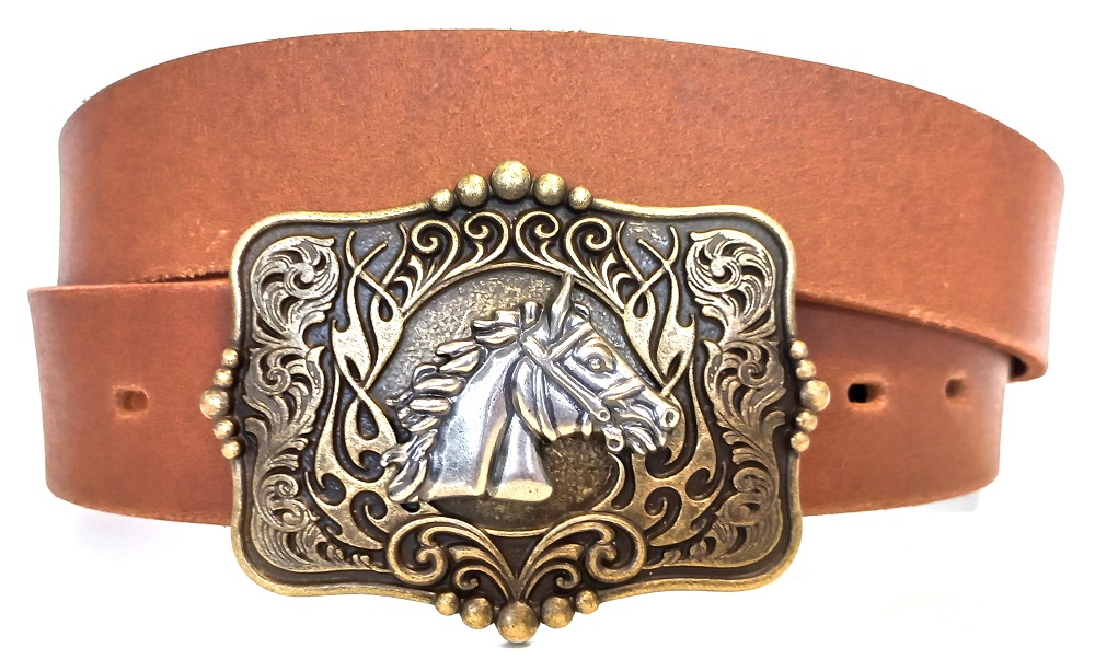 Westernový světlehnědý opasek z hovězí kůže s krásnou zlatomosaznou velkou přezkou.